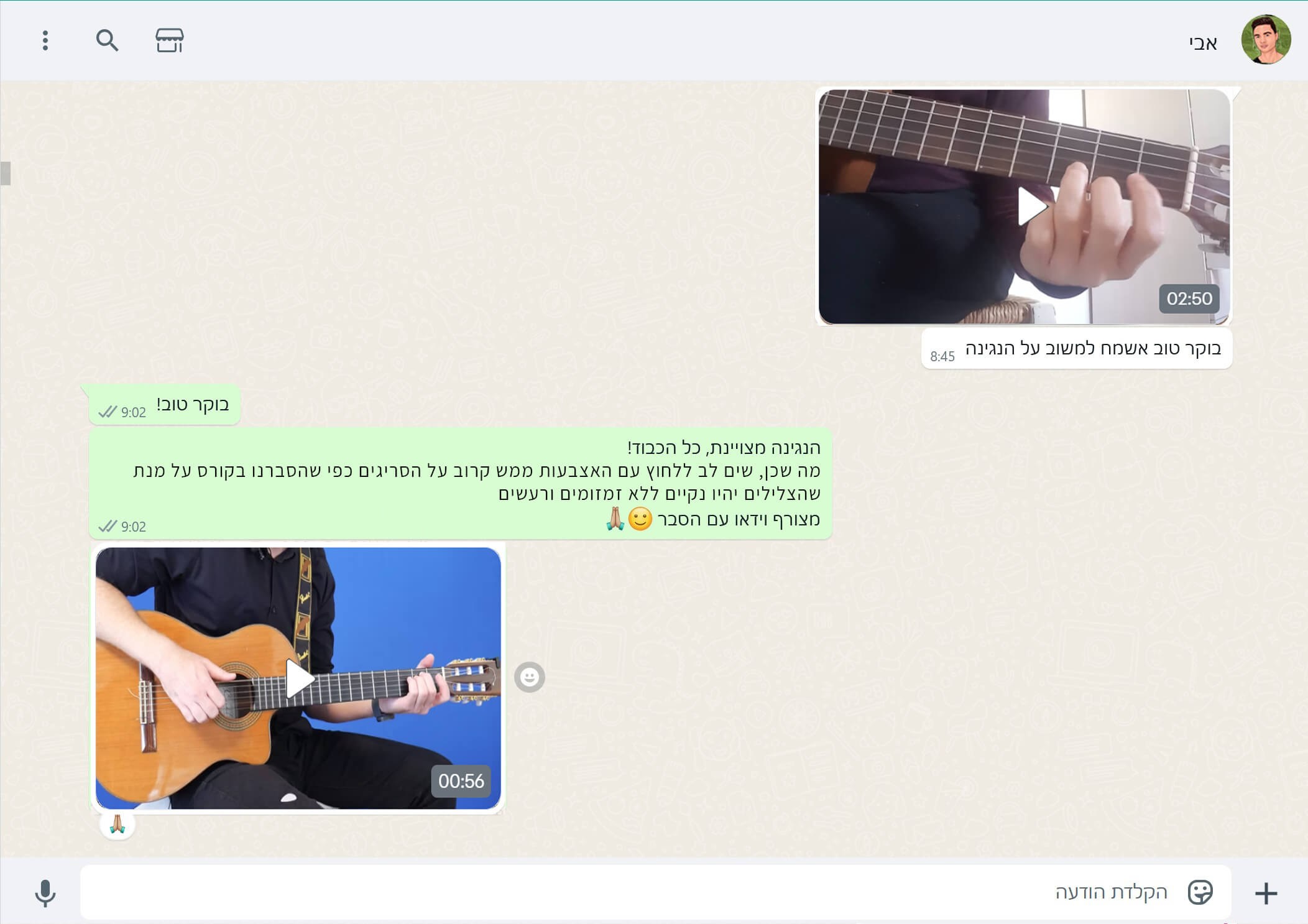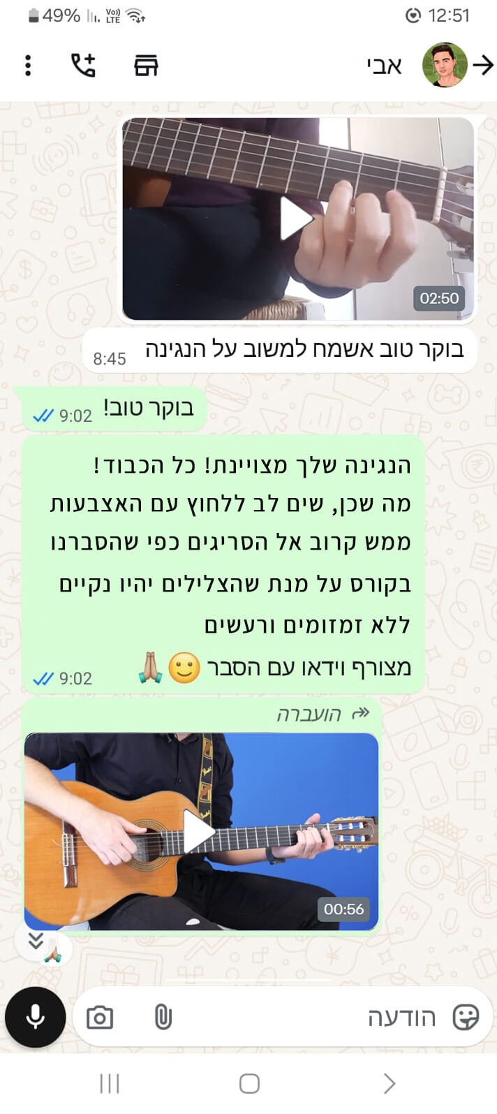 תמיכה מוזיקלית אנושית זה בדיוק מה שחסר ברוב הקורסים הדיגיטליים – ואצלנו זה חלק בלתי נפרד מהלמידה. שולחים סרטון נגינה למורה בוואטסאפ, והוא מחזיר פידבק אישי בוידאו עם תיקונים, עידוד וטיפים. זה כמו חצי מורה פרטי – וזאת הדרך הכי טובה ללמוד נכון, בלי לפתח טעויות נגררות ובלי תסכול. אם נתקעתם – פשוט שואלים